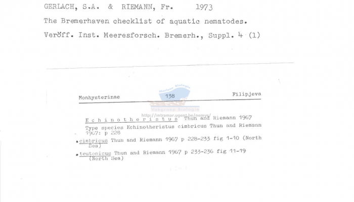 Description Nematode file-library of the Marine Biology Section (Ghent University, Belgium) JPG file - 150.30 kB - 1 651 x 945 pixels added on 2004-10-18660 viewsERMS taxaScan of literature (text) Echinotheristus Thun & Riemann, 1967checked Vanaverbeke, Jan 2014-04-10 From reference (S.d.). Nematode filing cabinet of the Marine Biology Sec... Download full sizeDownload full size