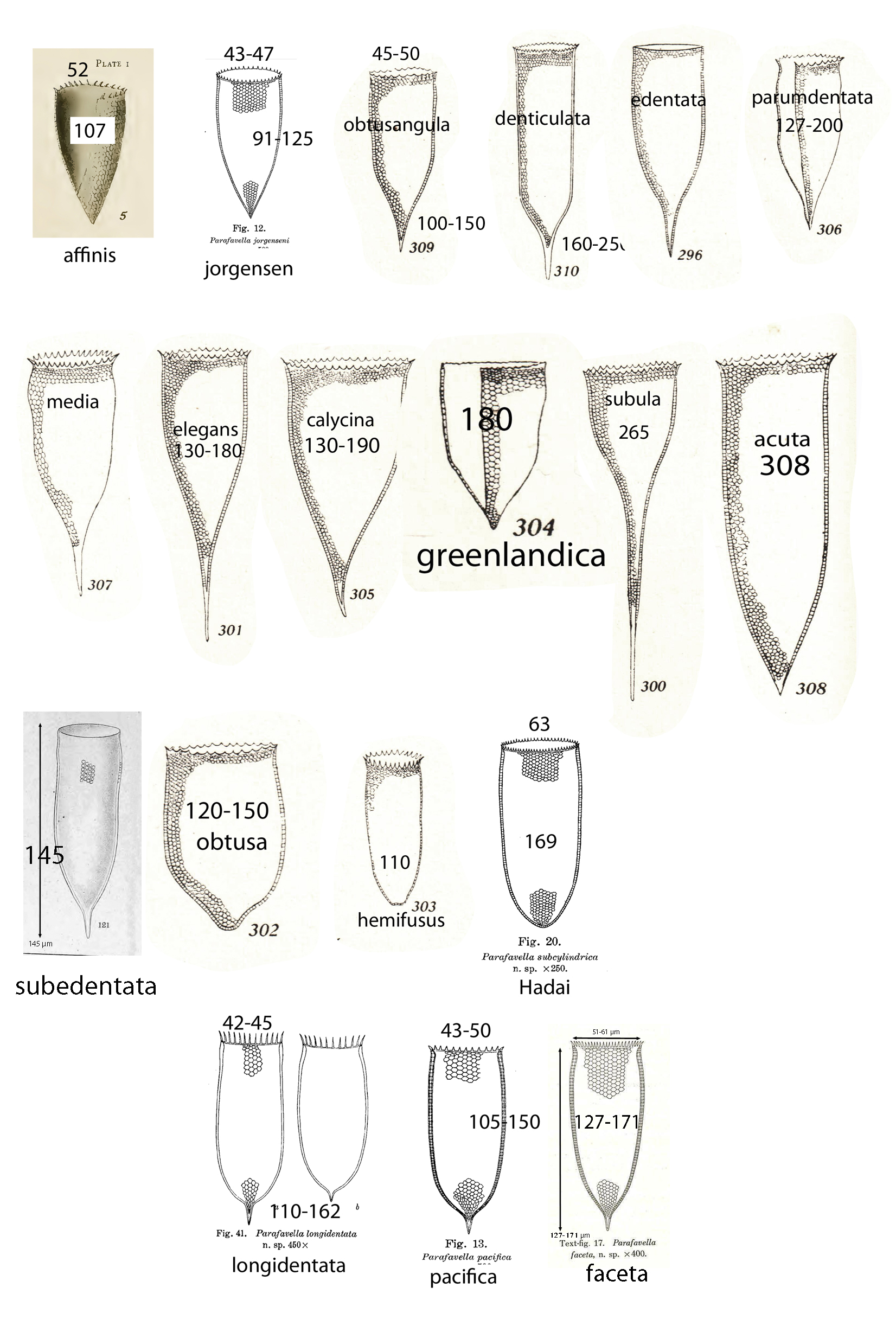 Description Illustrations of Parafavella species from Kofoid & Campbell, Campbell, Hada, etc. Where 2 sets of number appear, the larger numbers give the lorica length, smaller numbers the lorica oral opening diam. (µm)