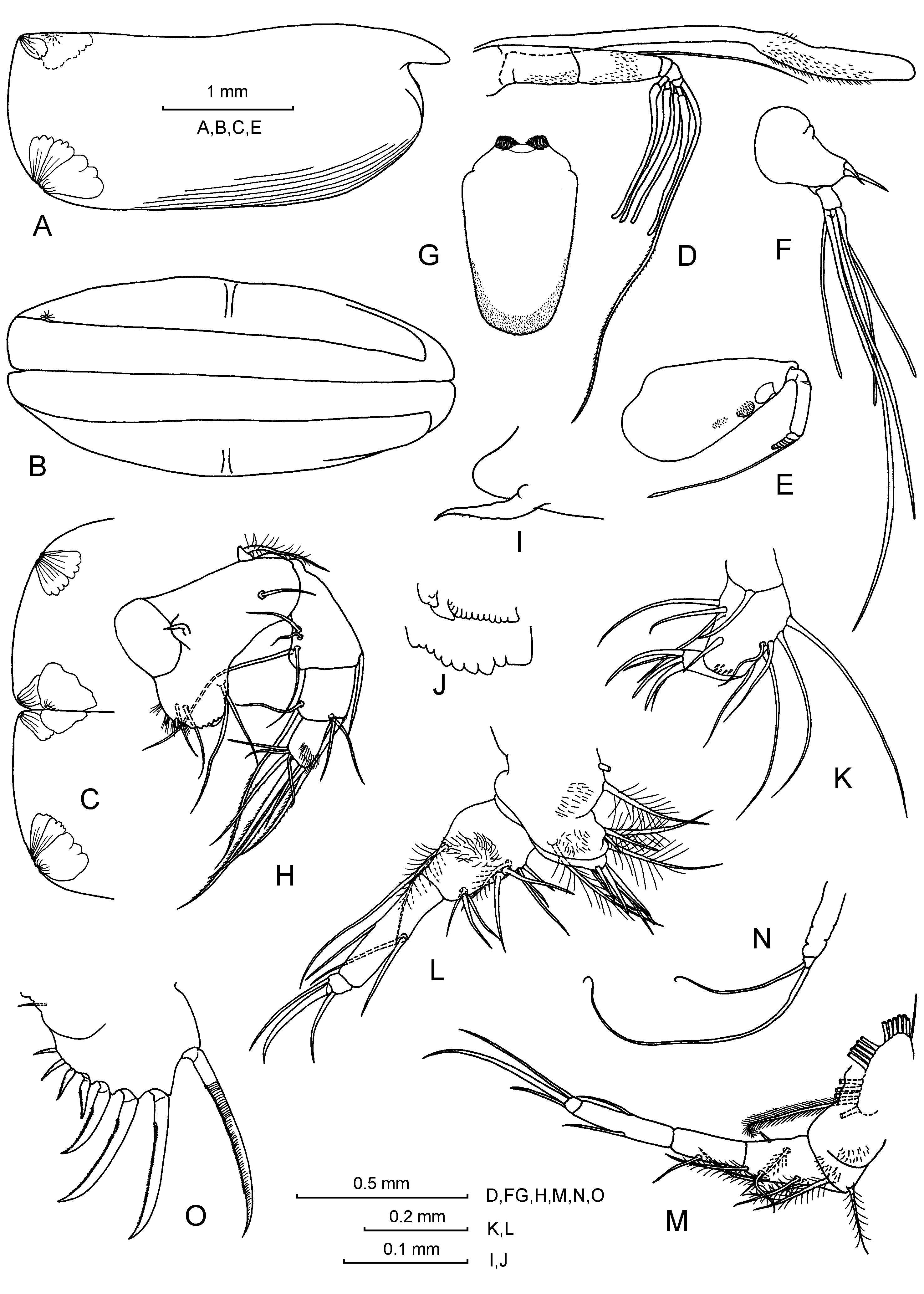 Description Female. Carapace: A, lateral; B, ventral; C, both valves outside: posterior margins. D, frontal organ and first antenna. Second antenna: E, protopodite and exopodite; F, endopodite. G, labrum. Mandible: H, basale, exopodite, endopodite; I, epipodial seta; J, coxal endite: toothed edge and distal tooth-list. K, maxilla. L, fifth limb. M, sixth limb. N, seventh limb. O, caudal furca.North Western Indian Ocean In: Drapun, I & S.L. Smith (2012) Halocyprid ostracods of the Arabian Sea region: Plate 10. https://www.researchgate.net/publication/280559278_Halocyprid_Ostracods_of_the_Arabian_Sea_Region ·